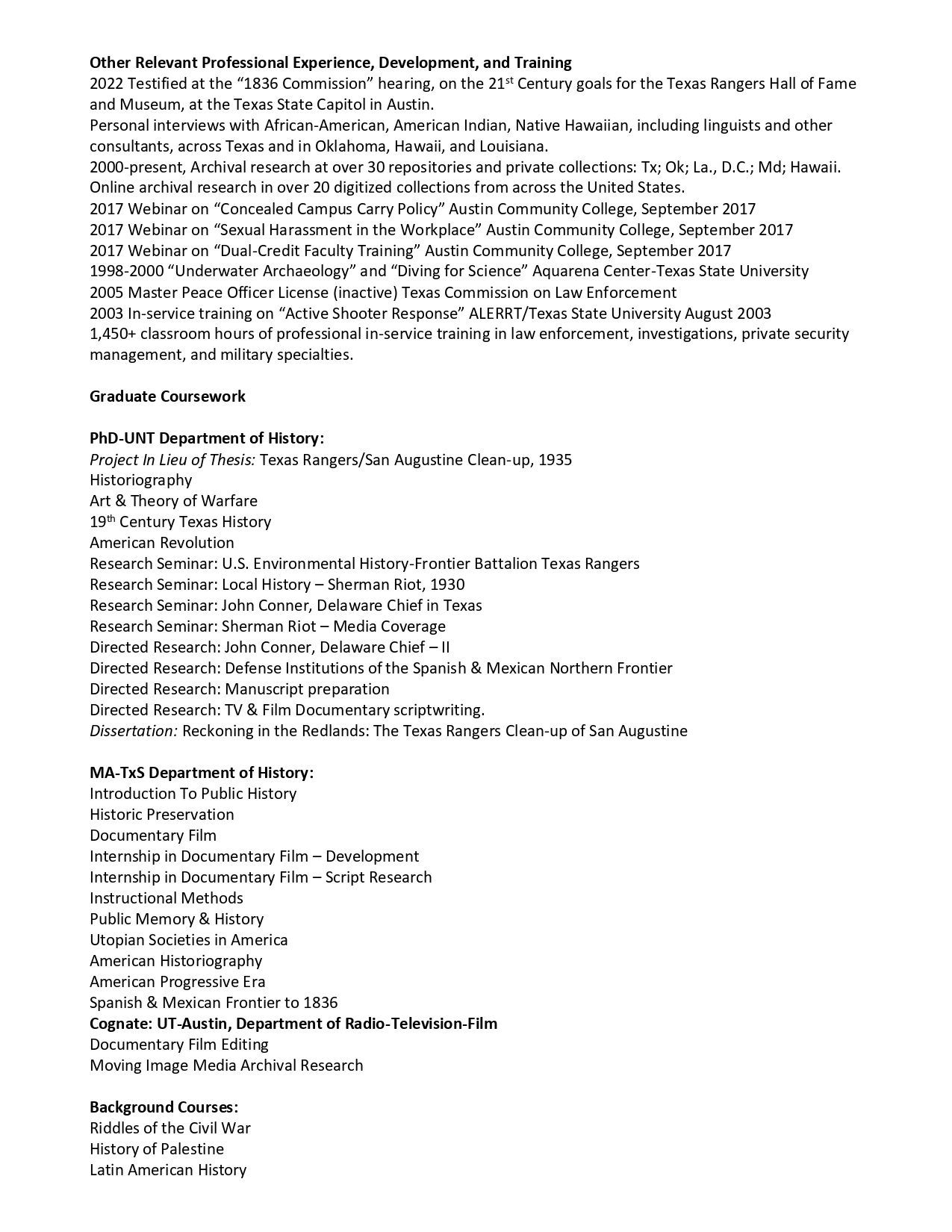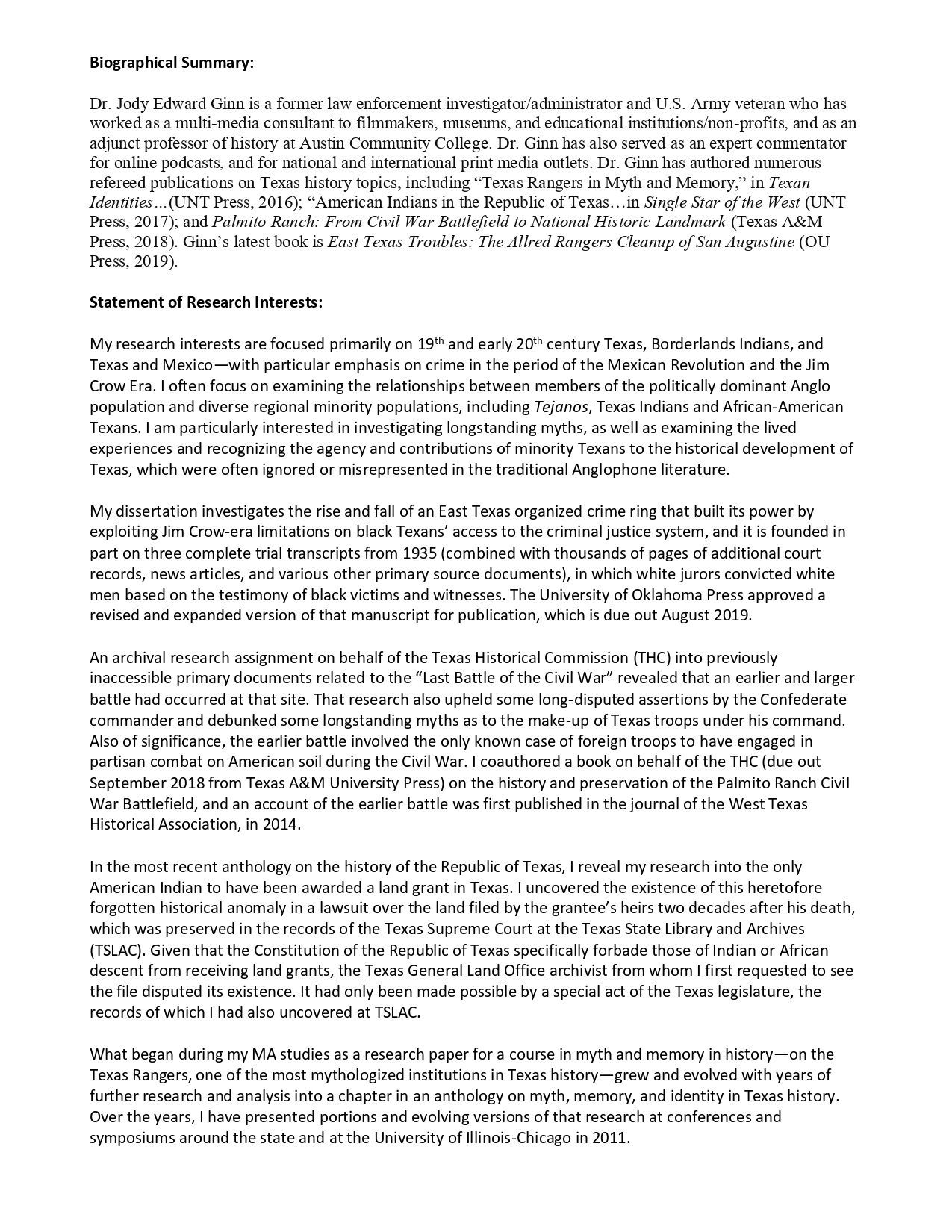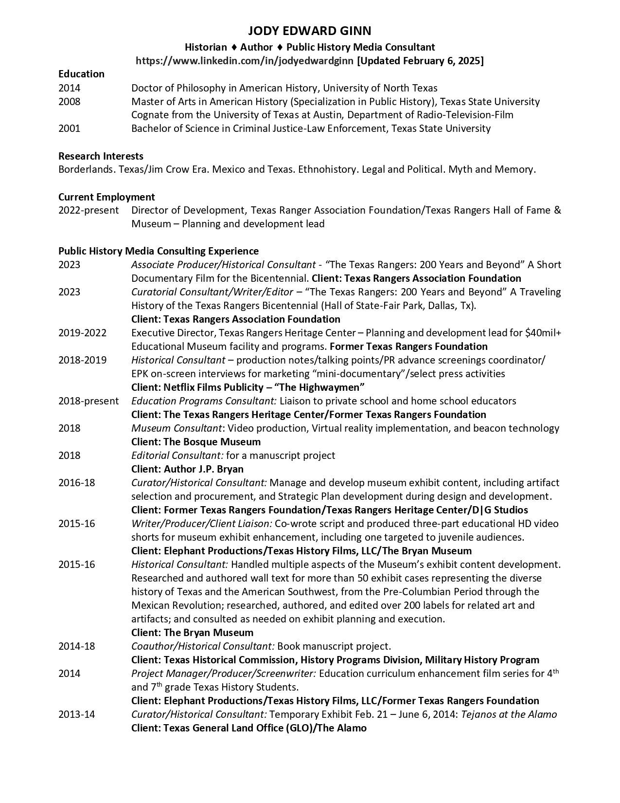 Dr. Jody Edward Ginn is the Director of Development for the Texas Ranger Association Foundation/Texas Ranger Hall of Fame and Museum in Waco. Prior to becoming a professional historian, Ginn served in the U.S. Army and Reserves and spent fifteen years in the profession of law enforcement, serving as a patrol, civil, and warrants officer, investigator, and administrator. Ginn holds a Doctor of Philosophy in History from the University of North Texas, in addition to a Master of Arts in History (with a specialization in Public History) and a Bachelor of Science in Criminal Justice from Texas State University. Ginn received the Fred White, Jr. Research Fellowship in Texas History from the Texas State Historical Association in 2001 and 2002 and has produced several refereed publications, including one journal article, two anthology chapters, a co-authored book, and his first solo book that launched in July 2019.