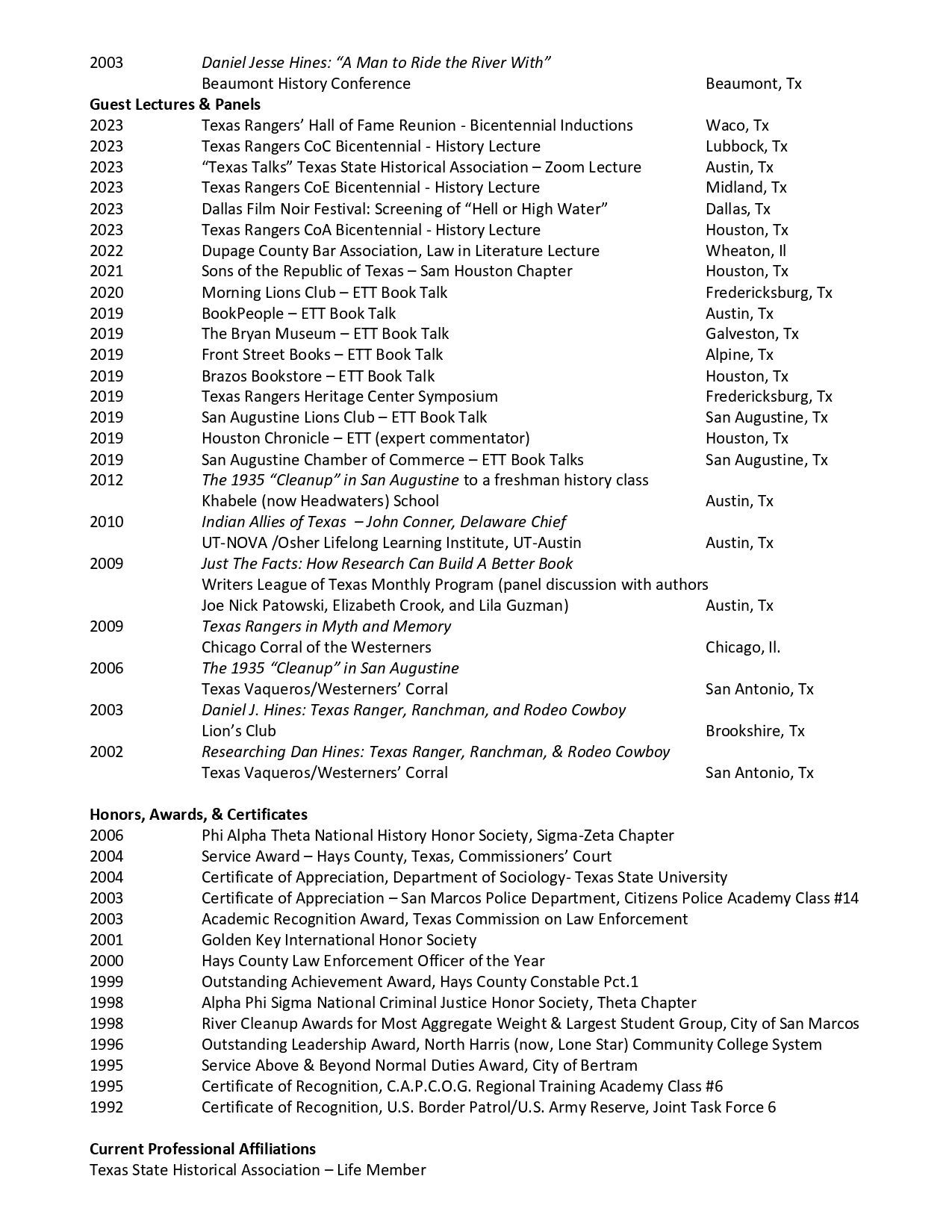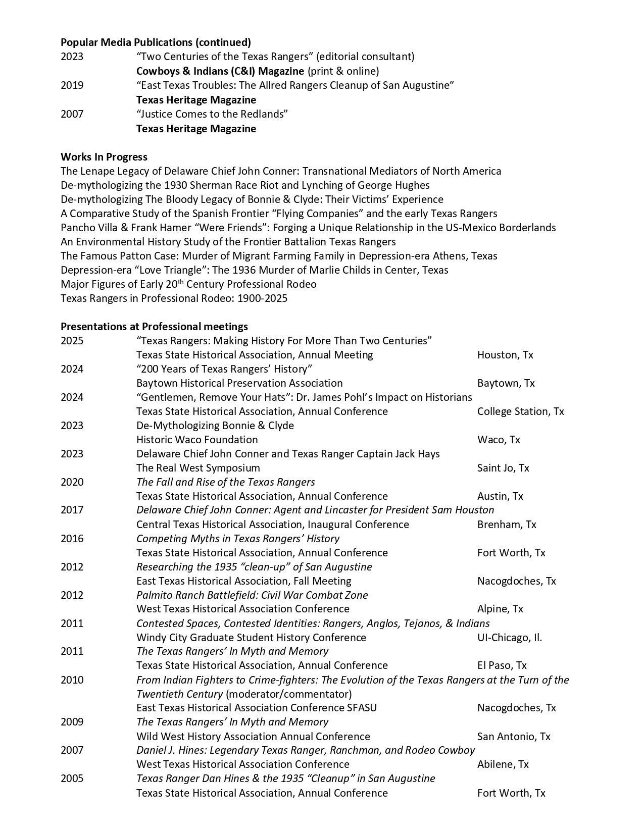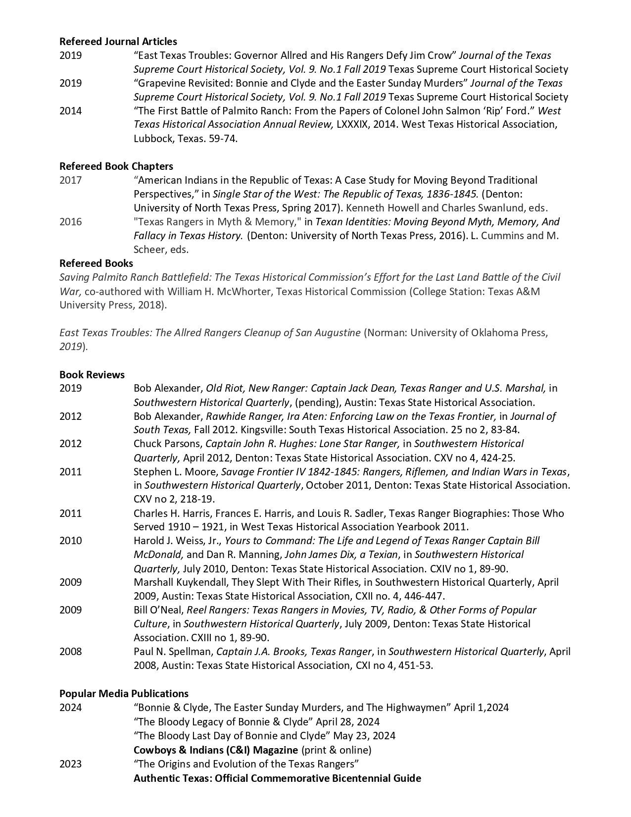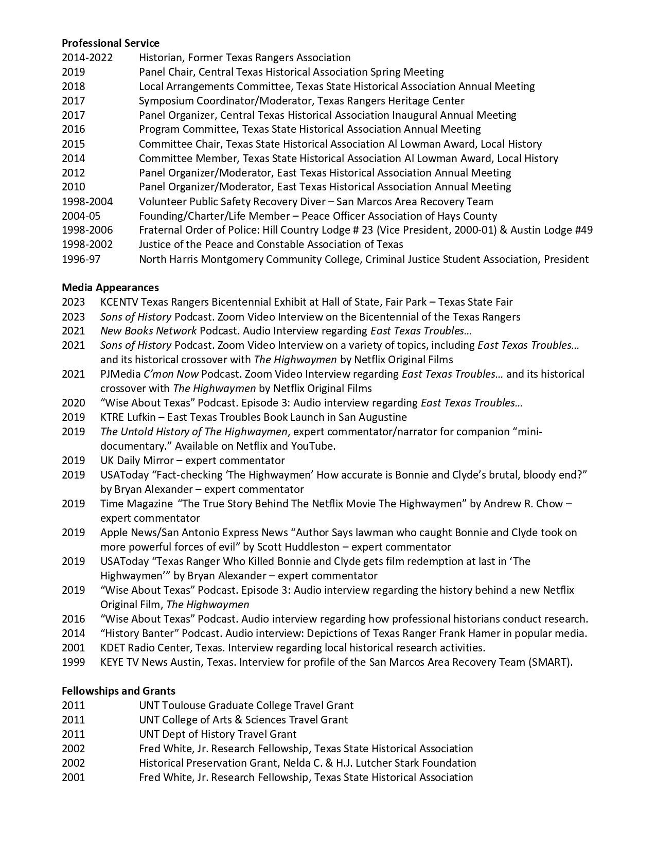 Ginn also works as a contract historical consultant, writer, and researcher on a variety of projects, including museums, books, and educational and promotional films, and as an adjunct associate professor of history at Austin Community College. Most recently, he served as a historical consultant for publicity on the blockbuster new Netflix Original Film, “The Highwaymen” (starring Kevin Costner, Woody Harrelson, Kathy Bates, and Kim Dickens). Ginn has made numerous media appearances in local, state, and national media, as well as online podcasts, including “New Books Network,” “Wise About Texas,” and “The Sons of History,” and has been quoted in print media to include USAToday, Time Magazine, the UK Daily Mirror, and Bustle.com.